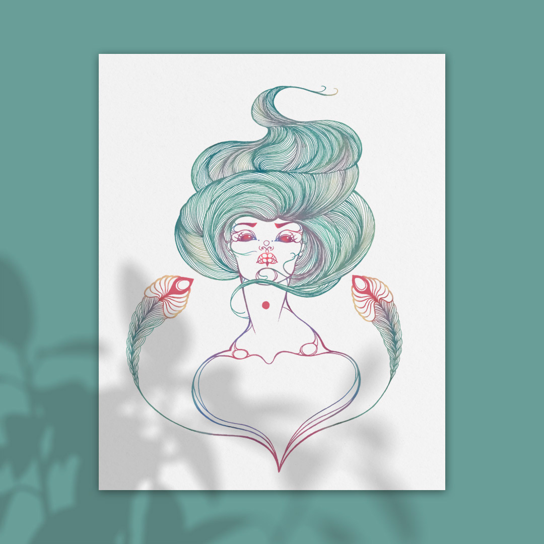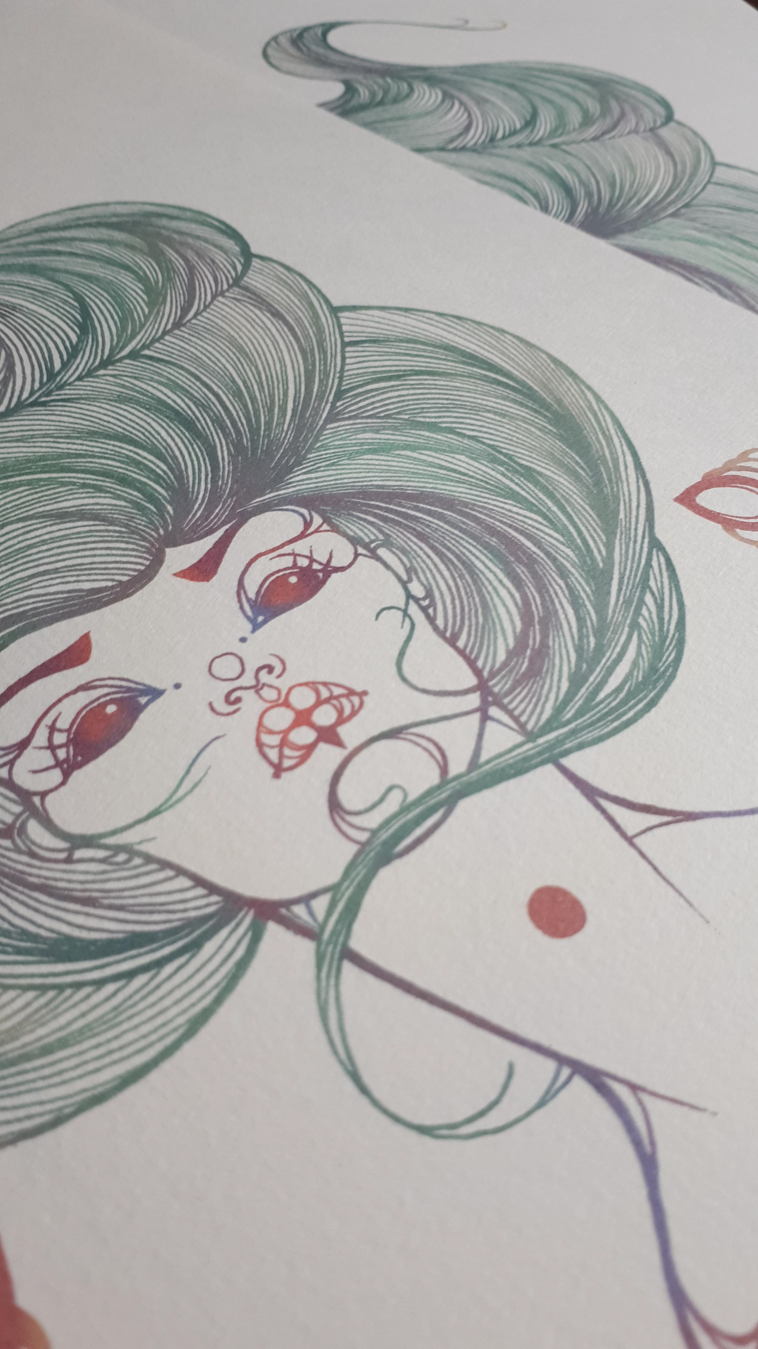Illustration à la pointe fine colorisée numériquement. Jouissance et absence.