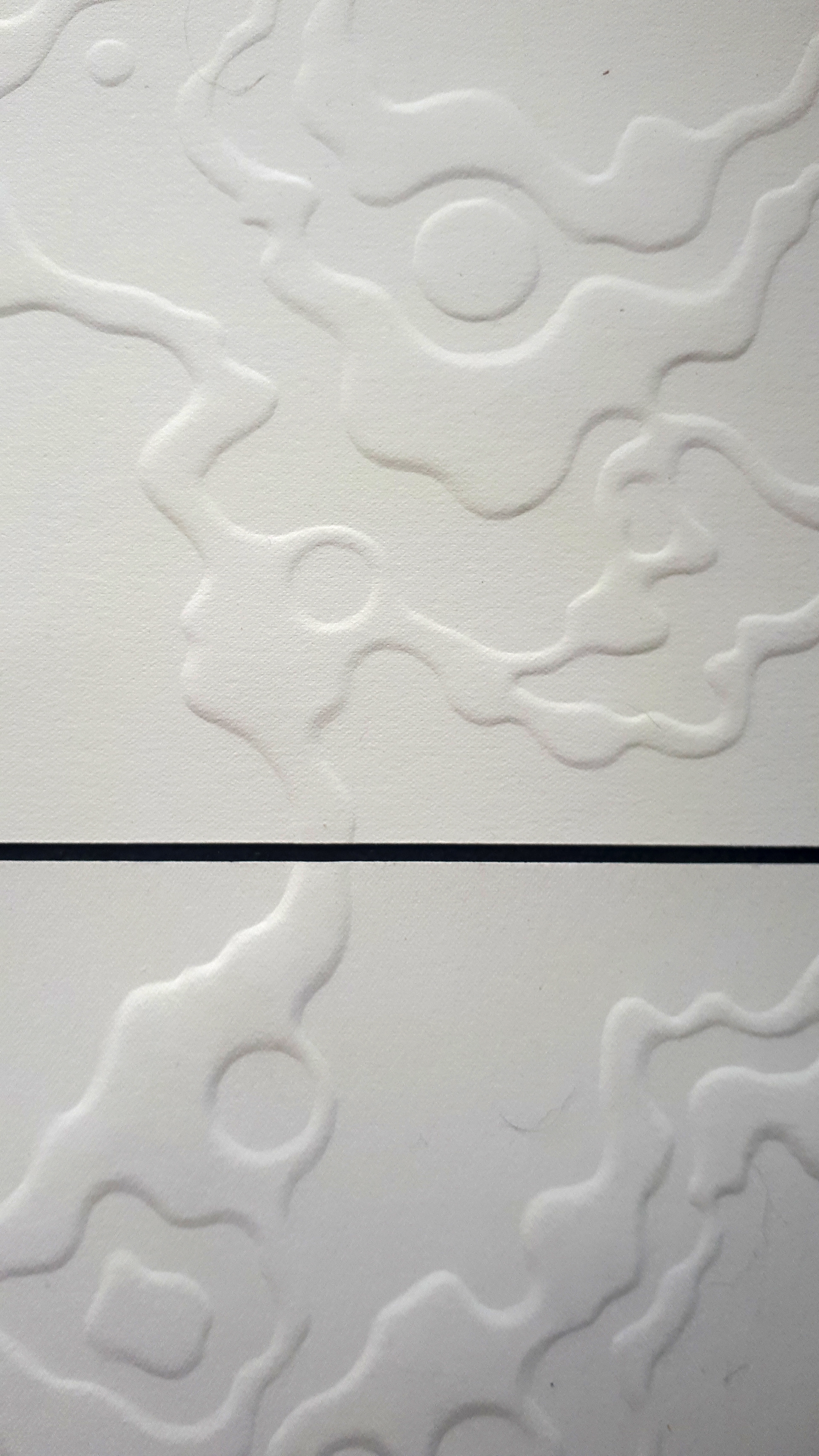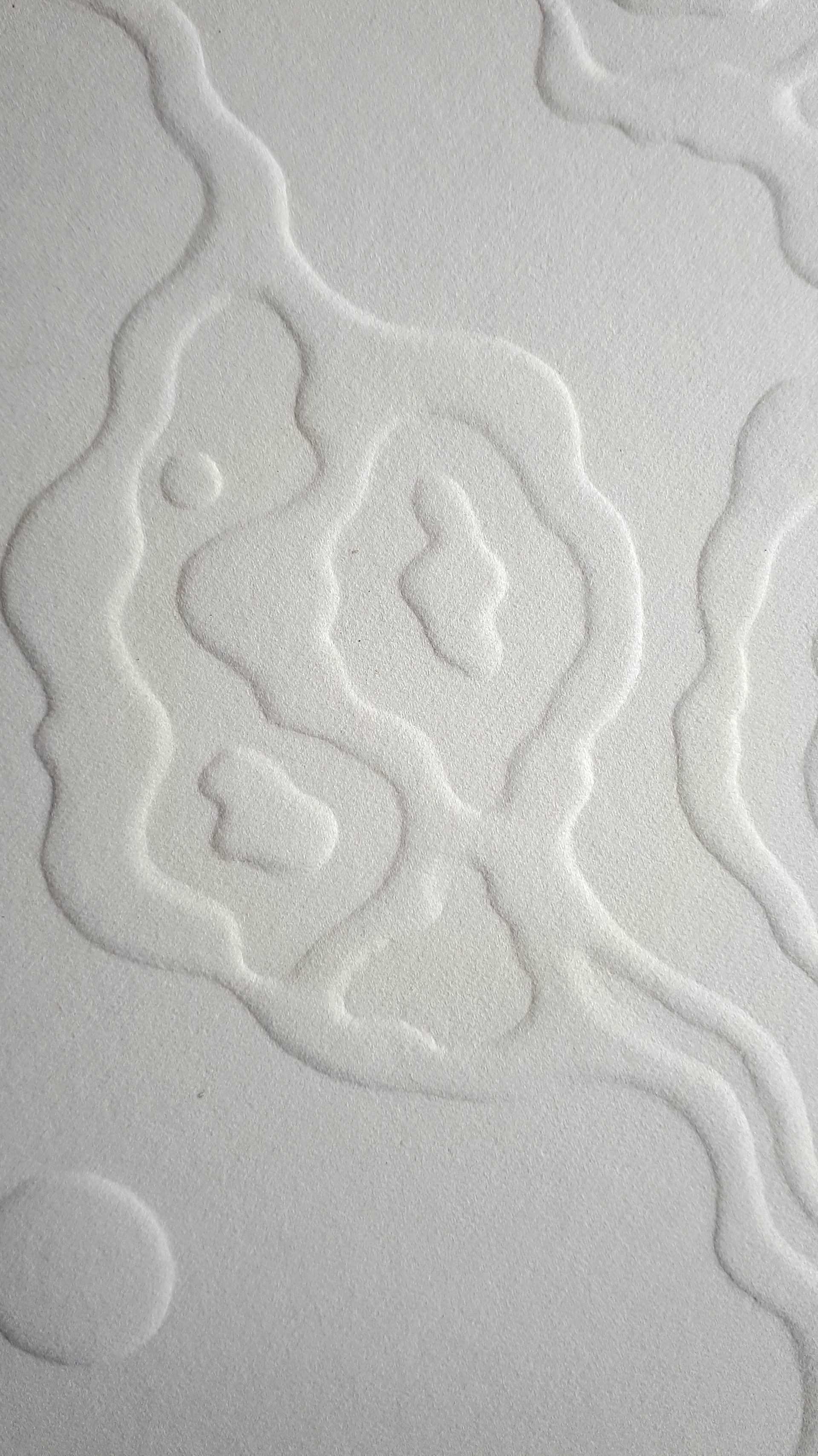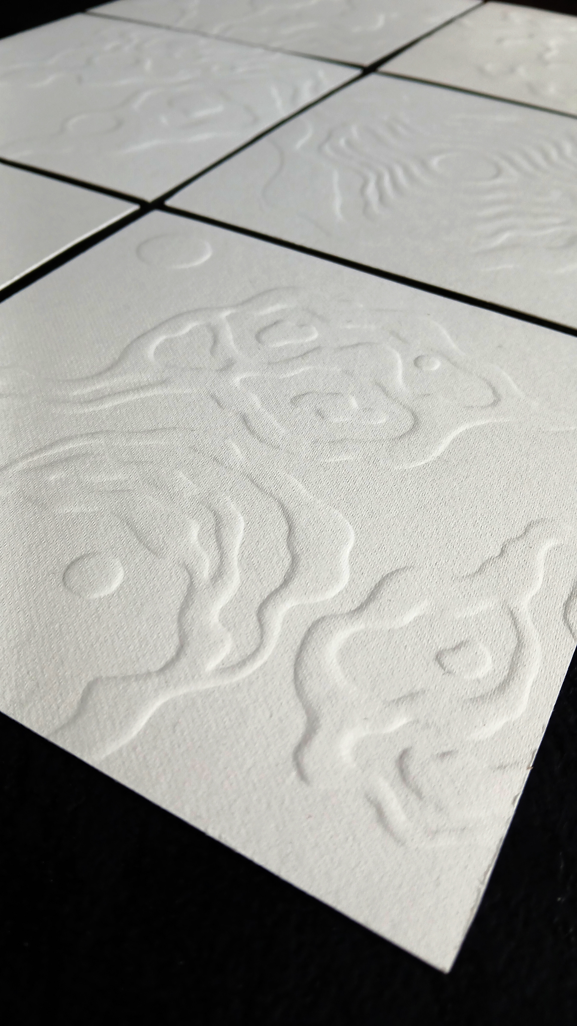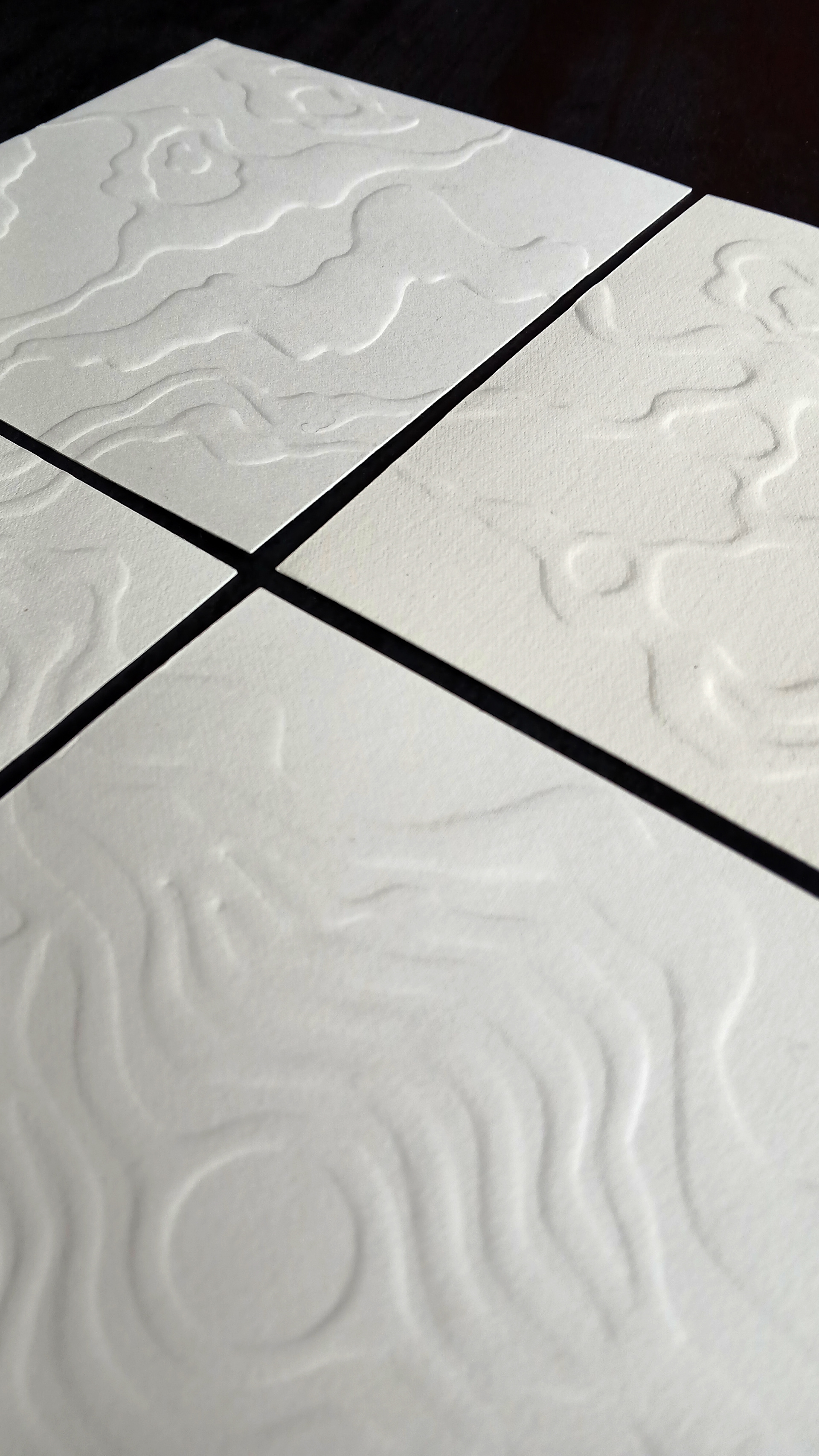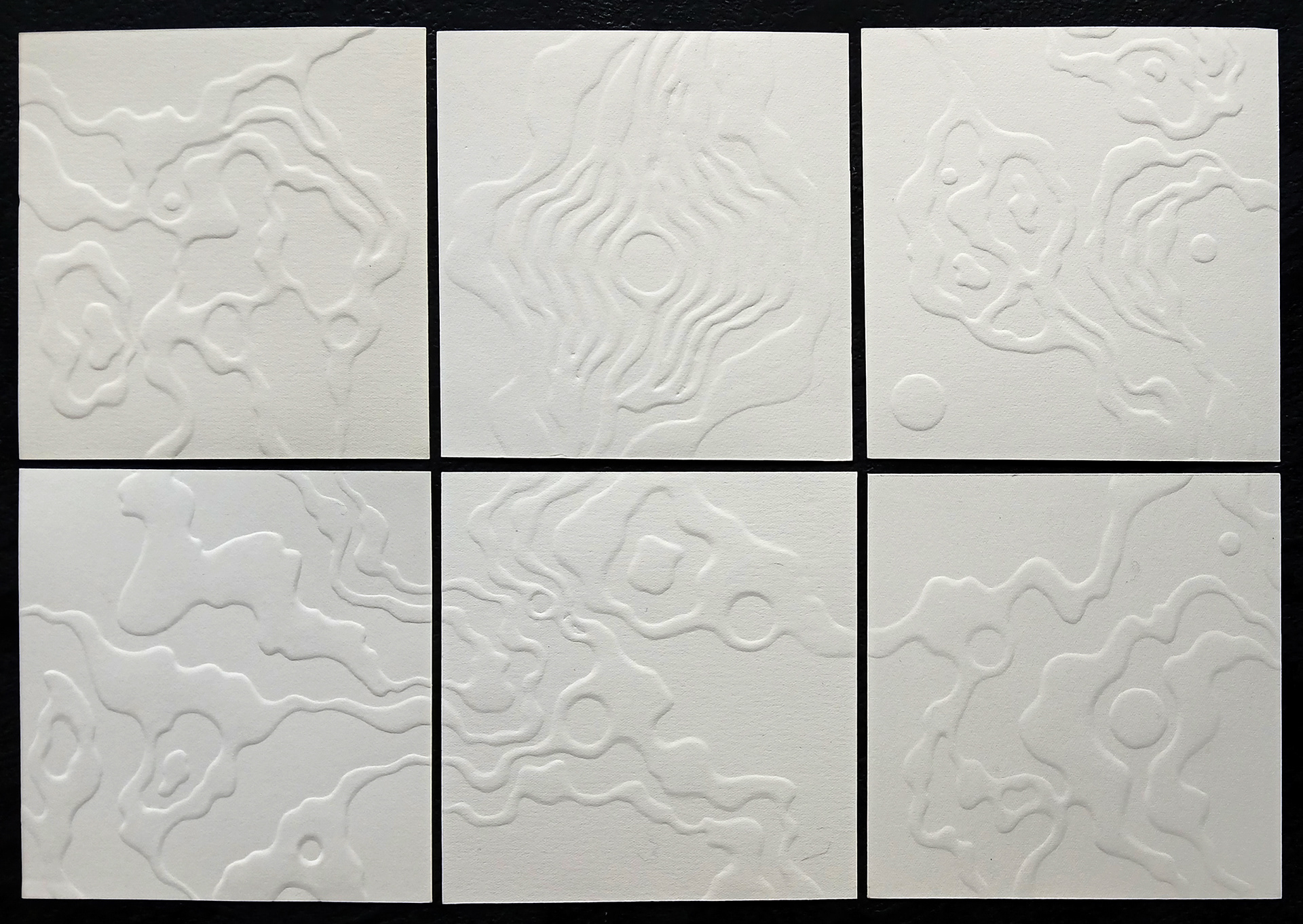 Des motifs organiques qui évoquent un paysage vu du dessus, dont les formes se poursuivent d'un support à l'autre. Gaufrage à sec.