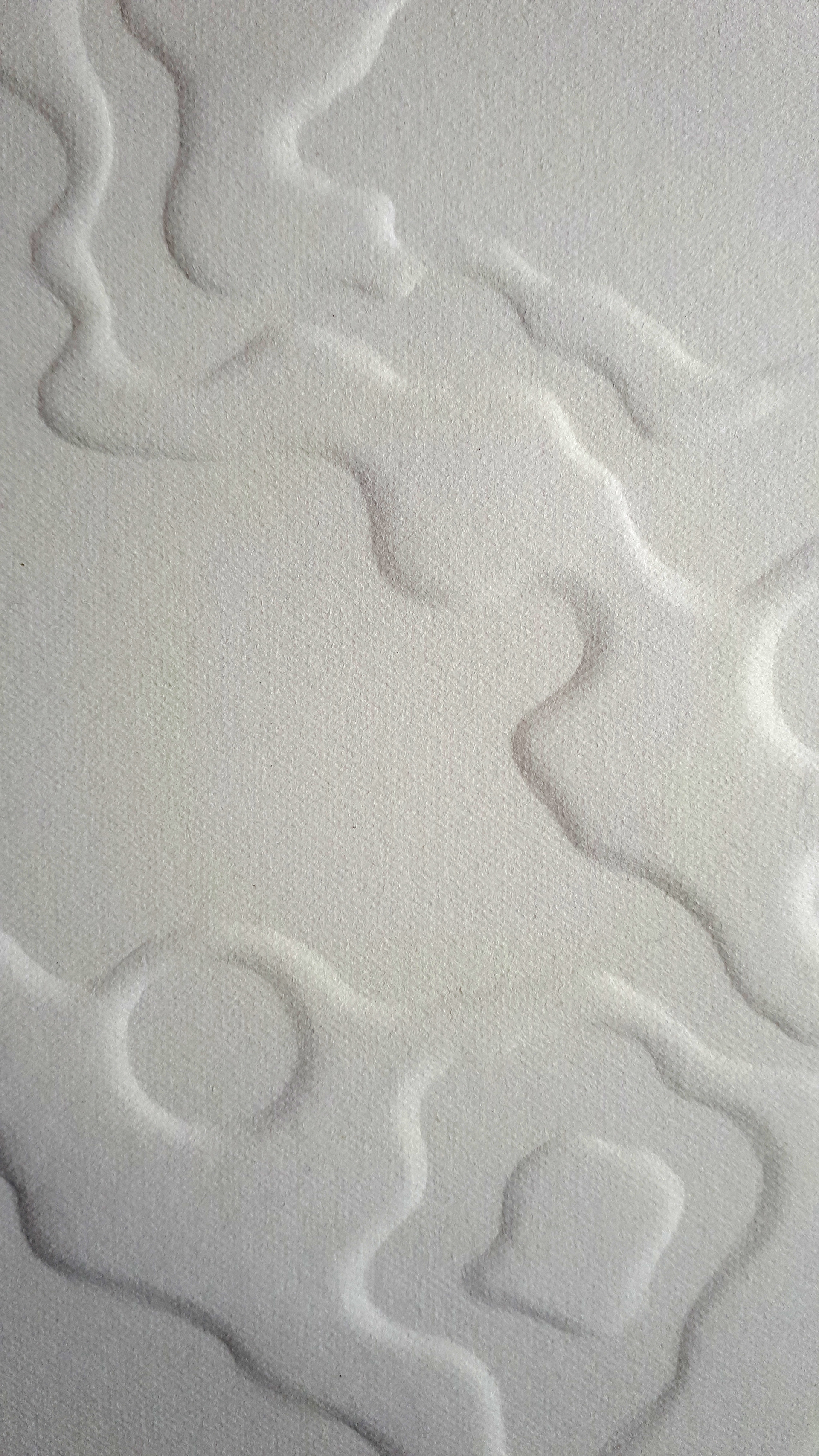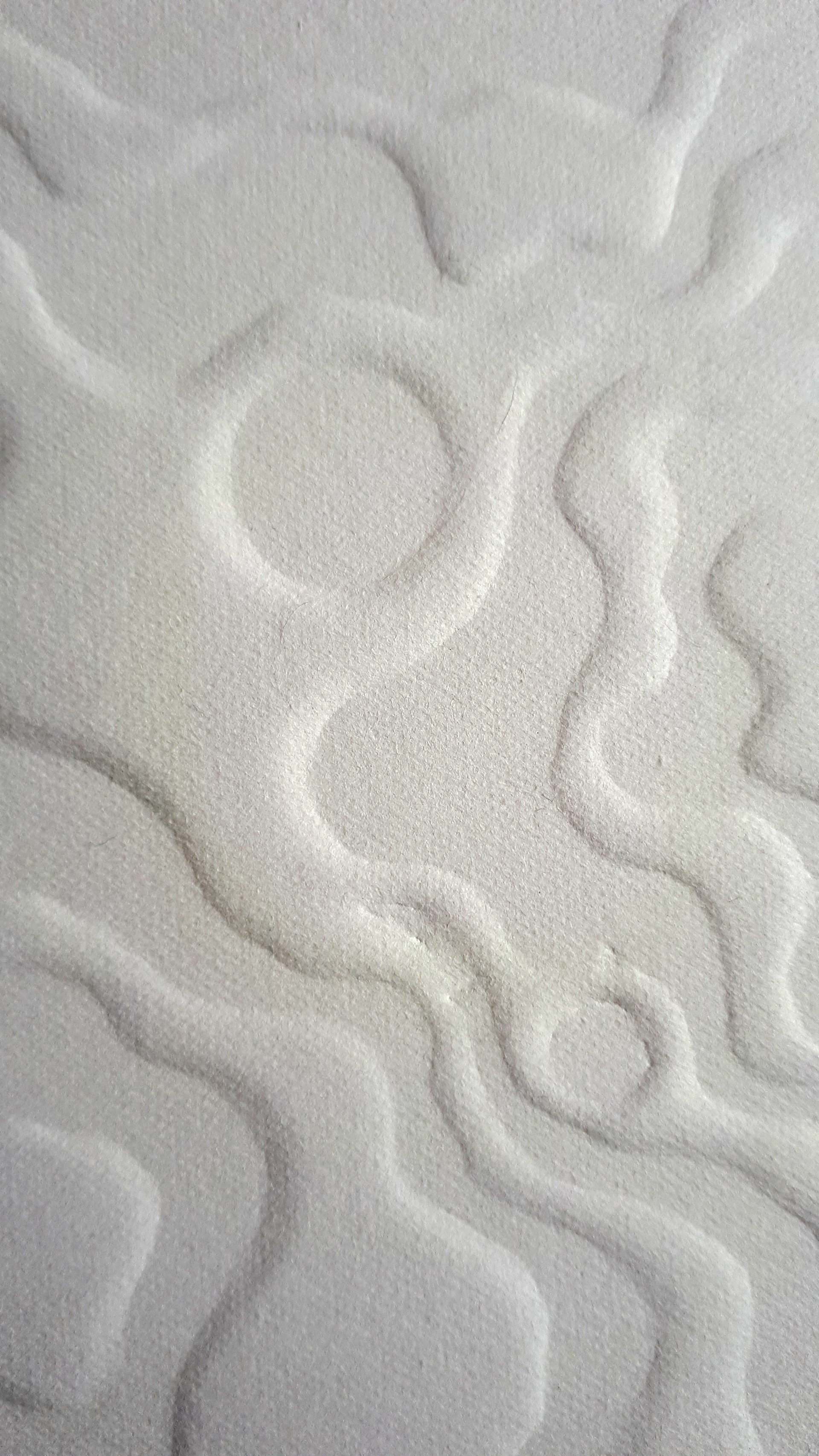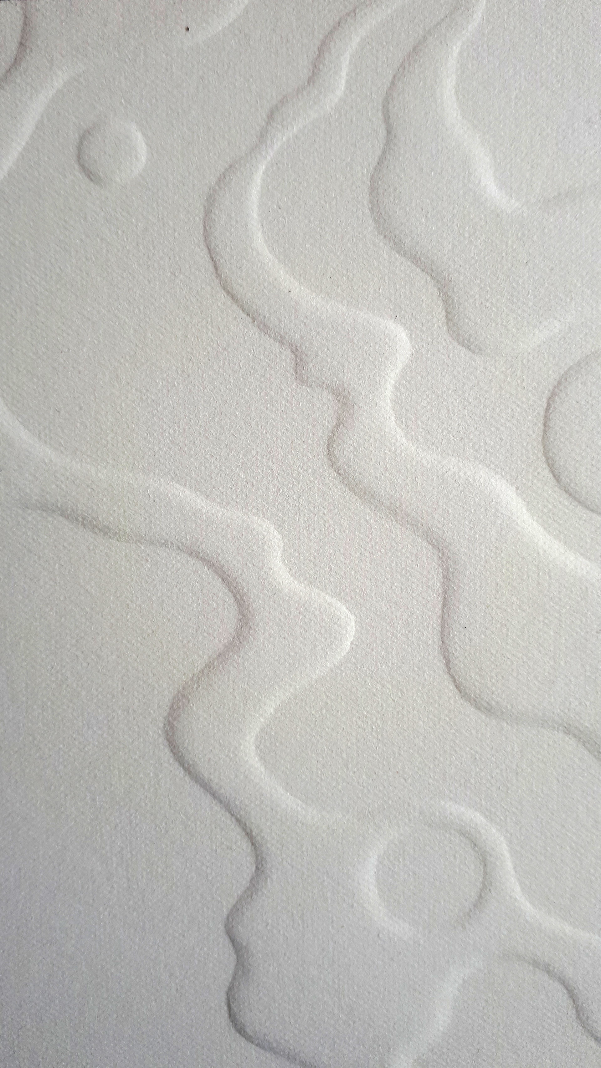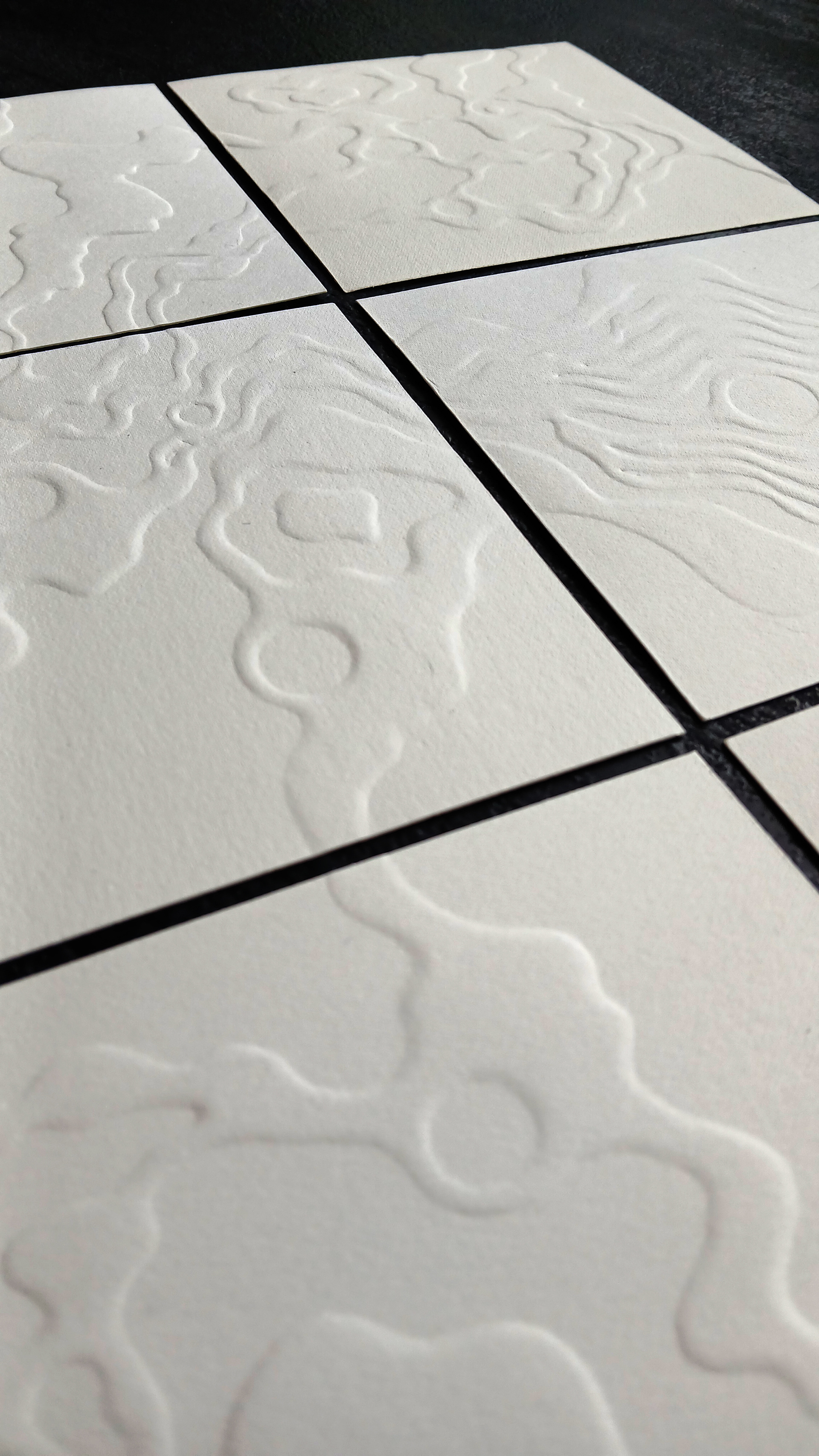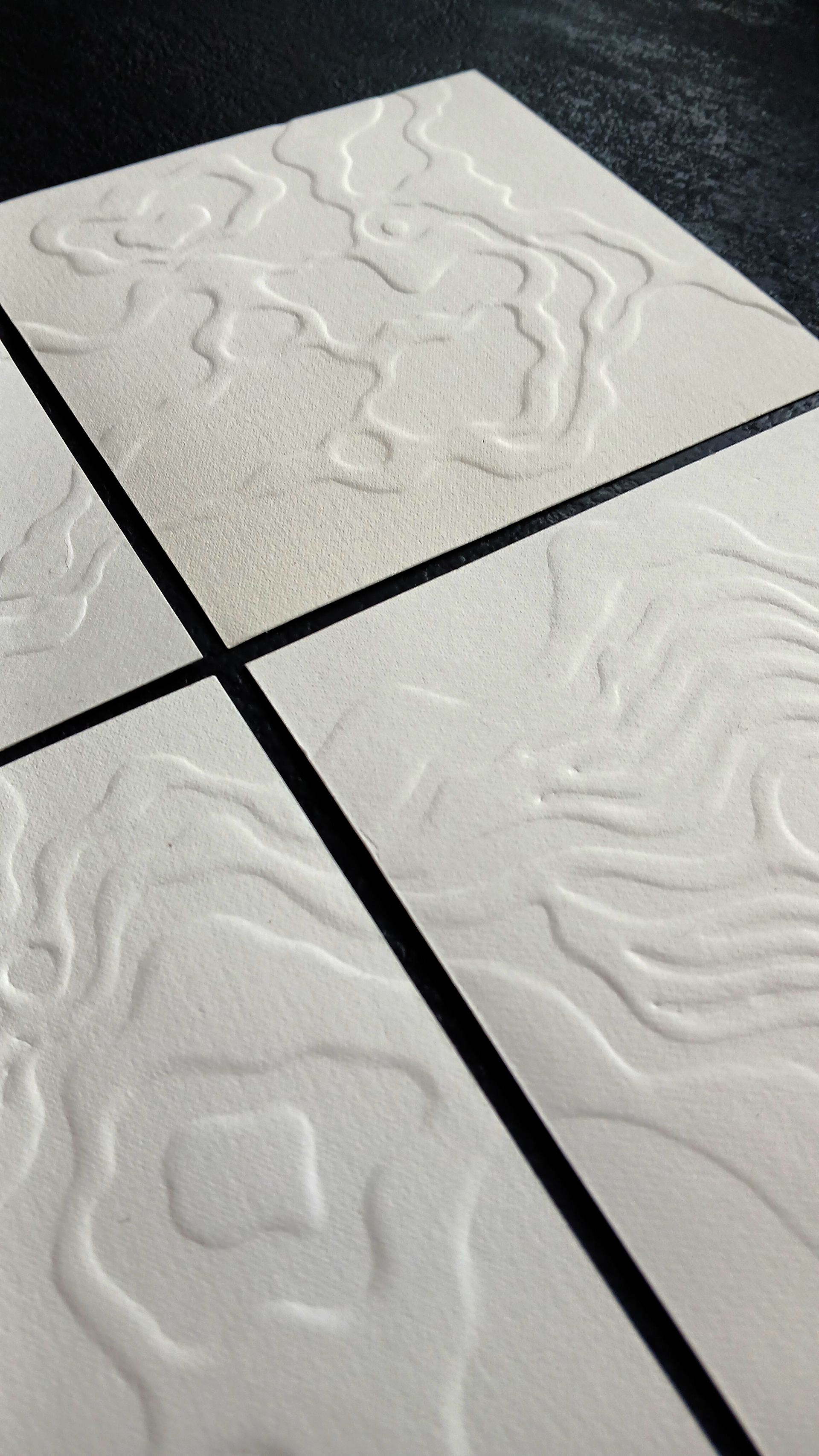 Des motifs organiques qui évoquent un paysage vu du dessus, dont les formes se poursuivent d'un support à l'autre. Gaufrage à sec.