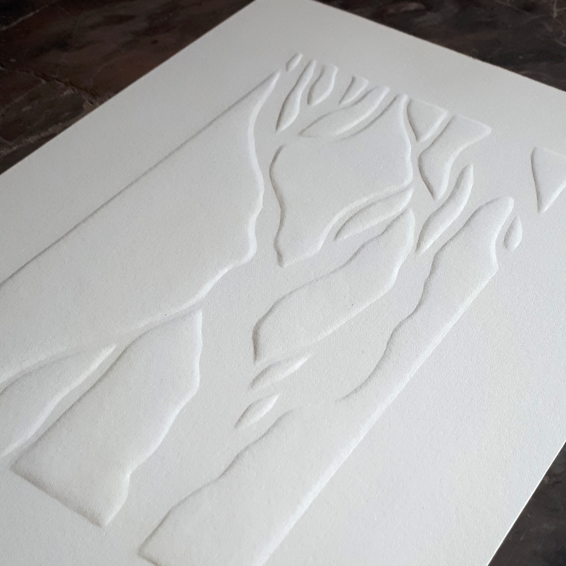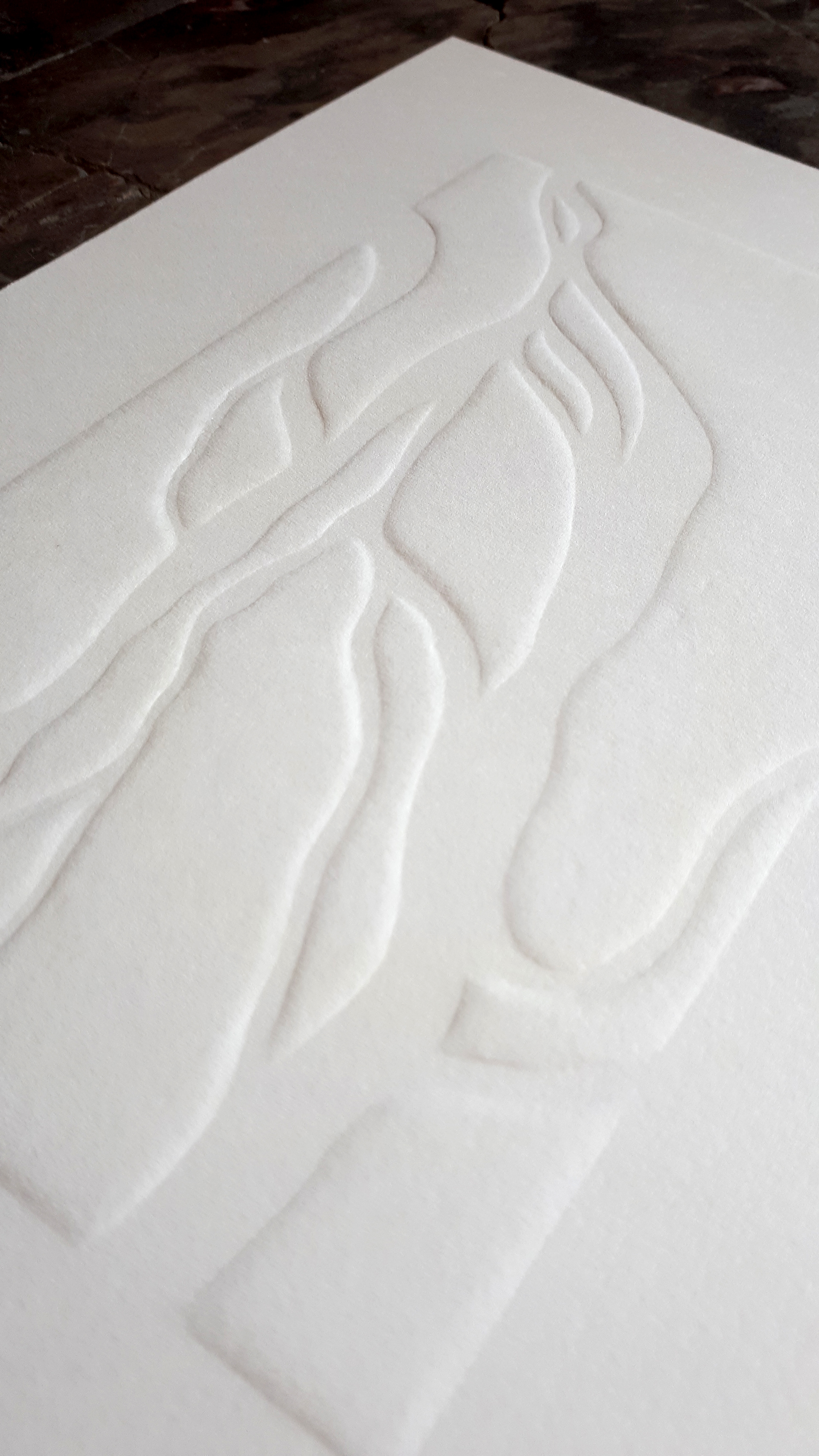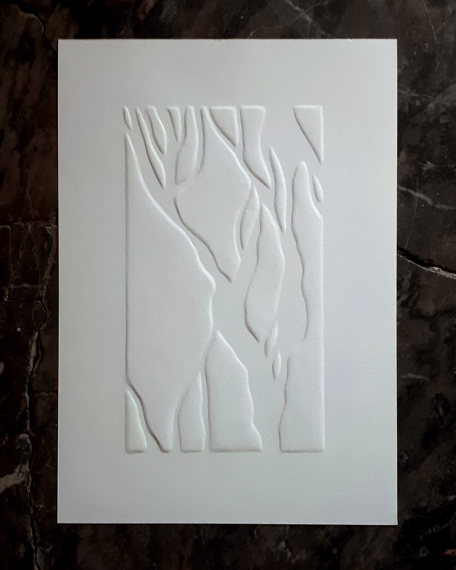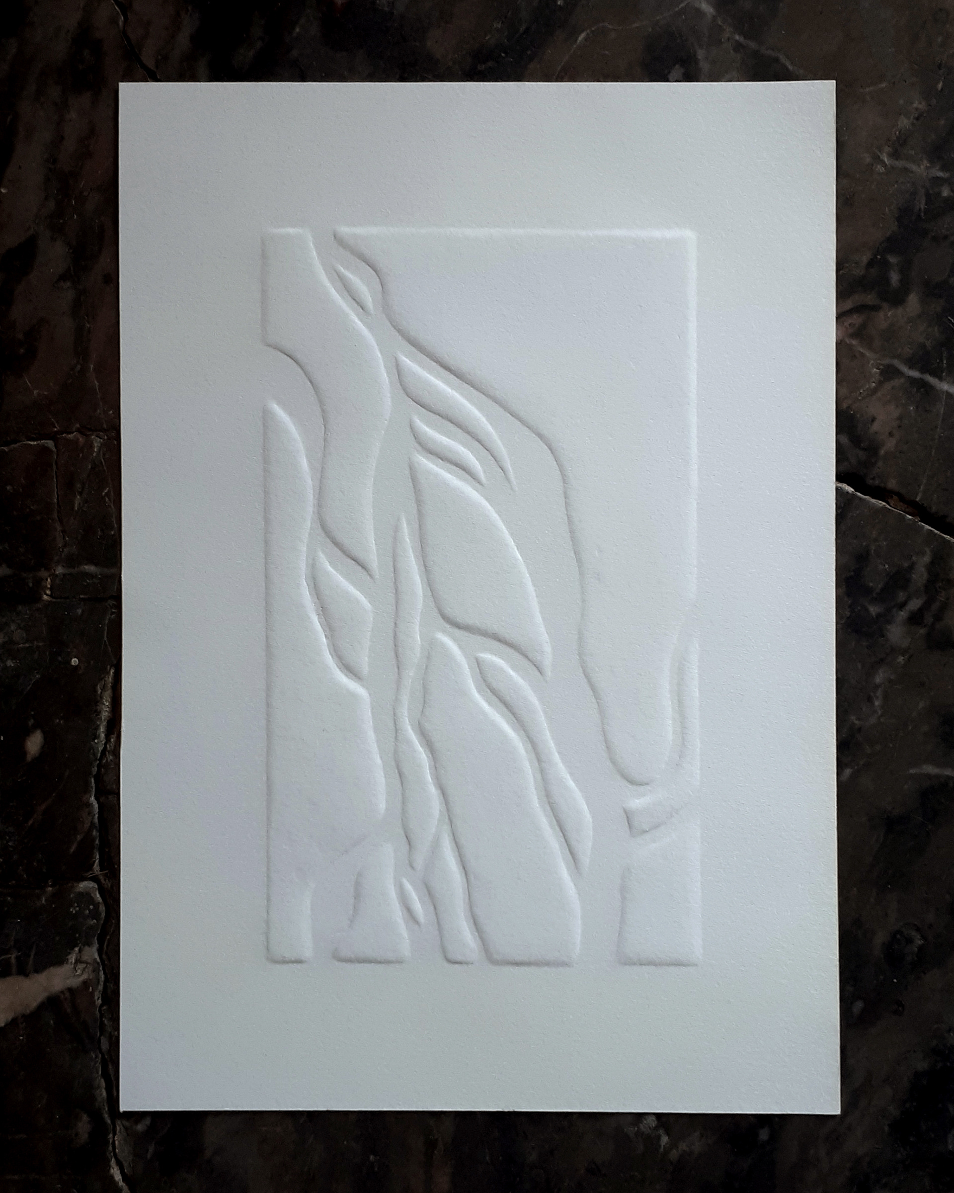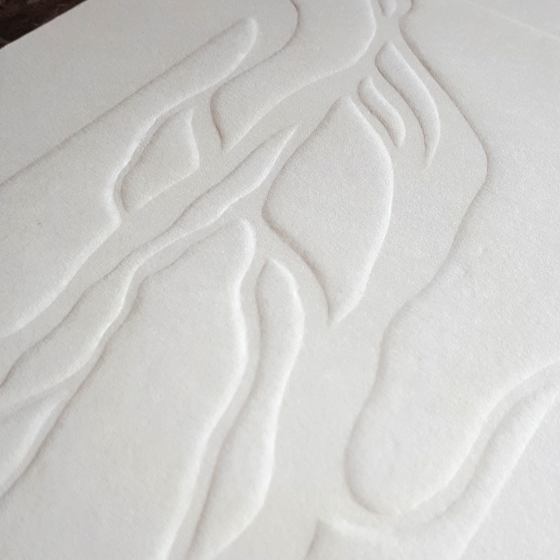 Gaufrages à sec dont les formes d'apparence abstraites sont inspirées des sillons laissés par la mer sur le sable. Une stylisation d'un détail du paysage qui prend vie au gré de la lumière.