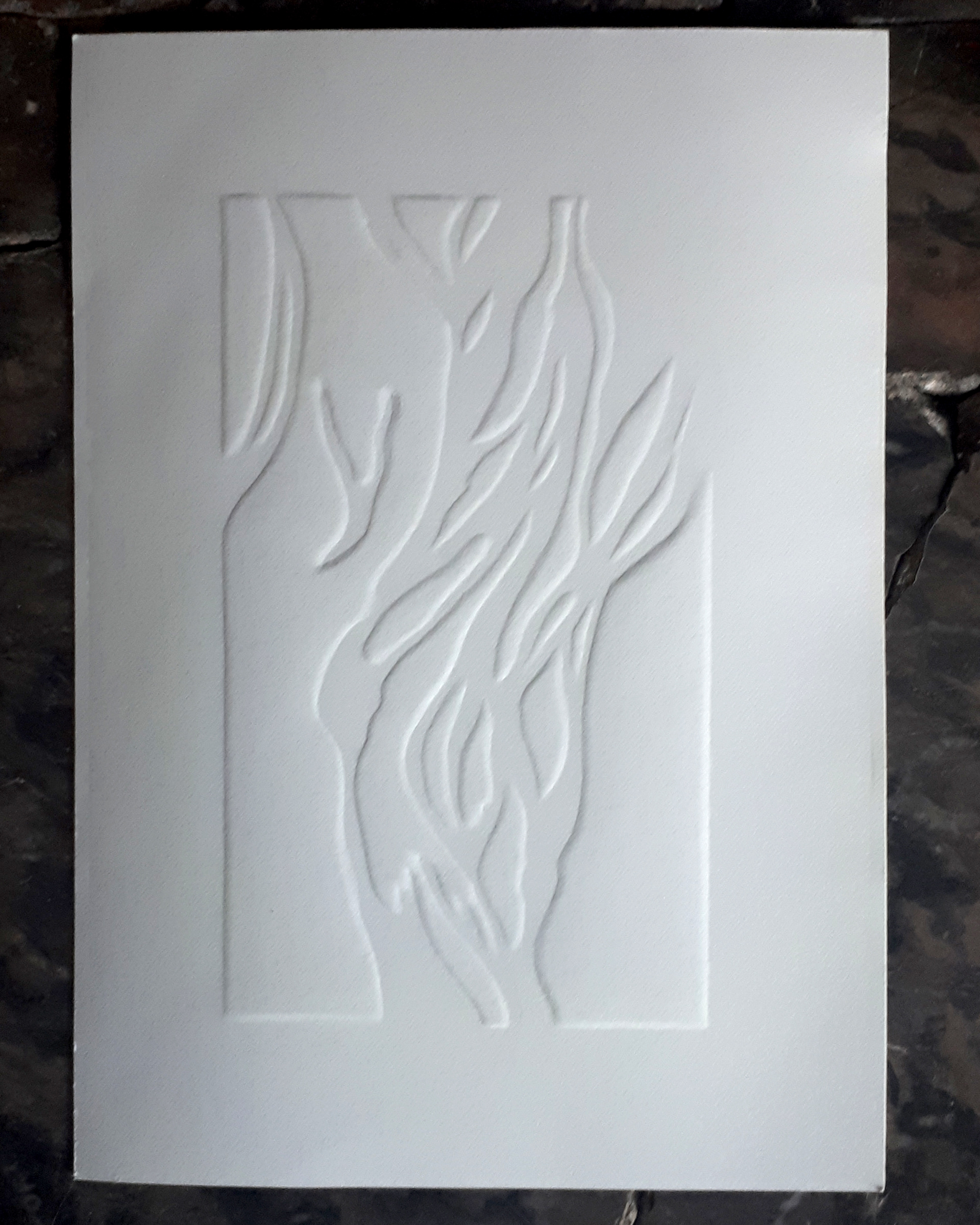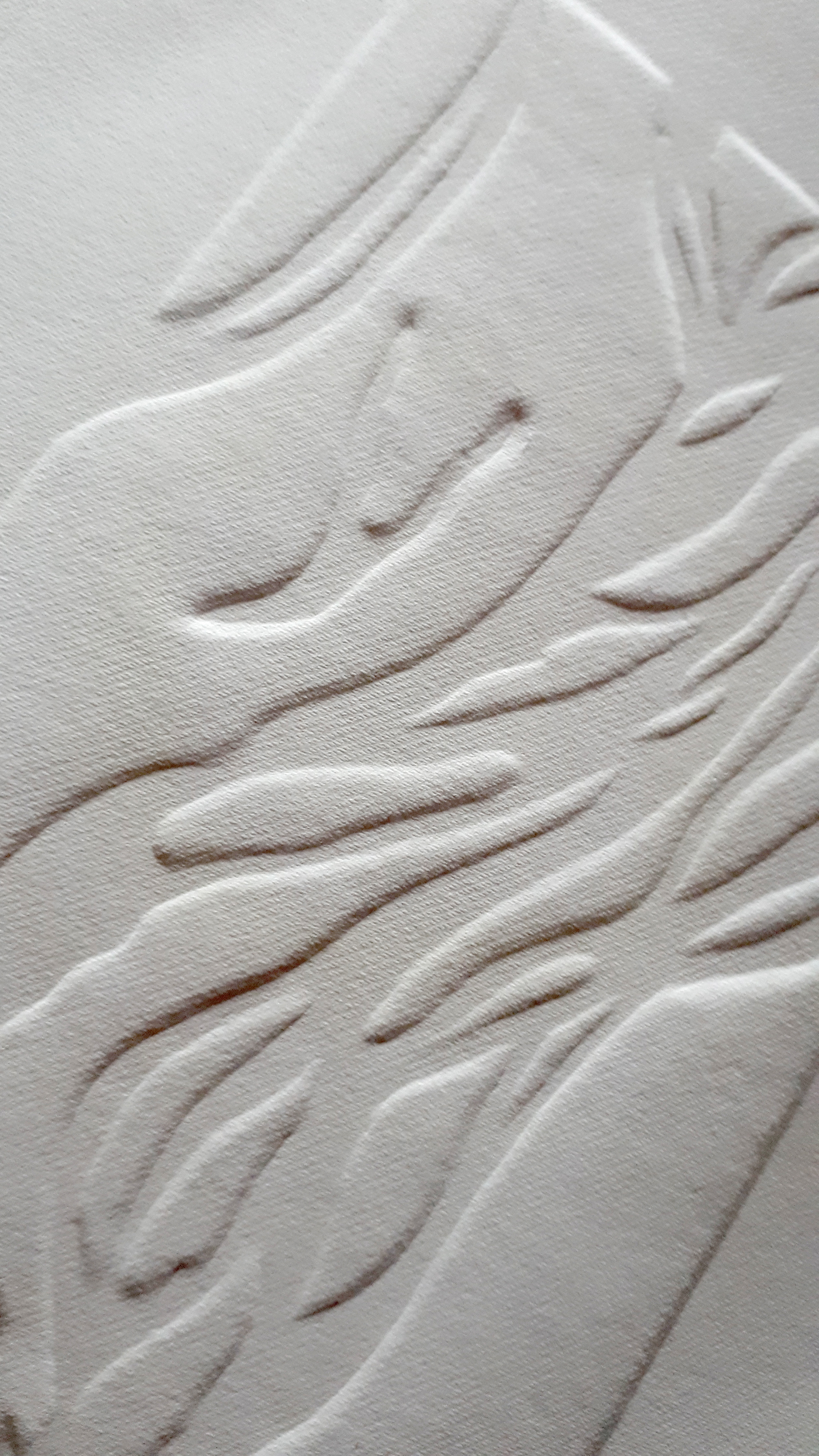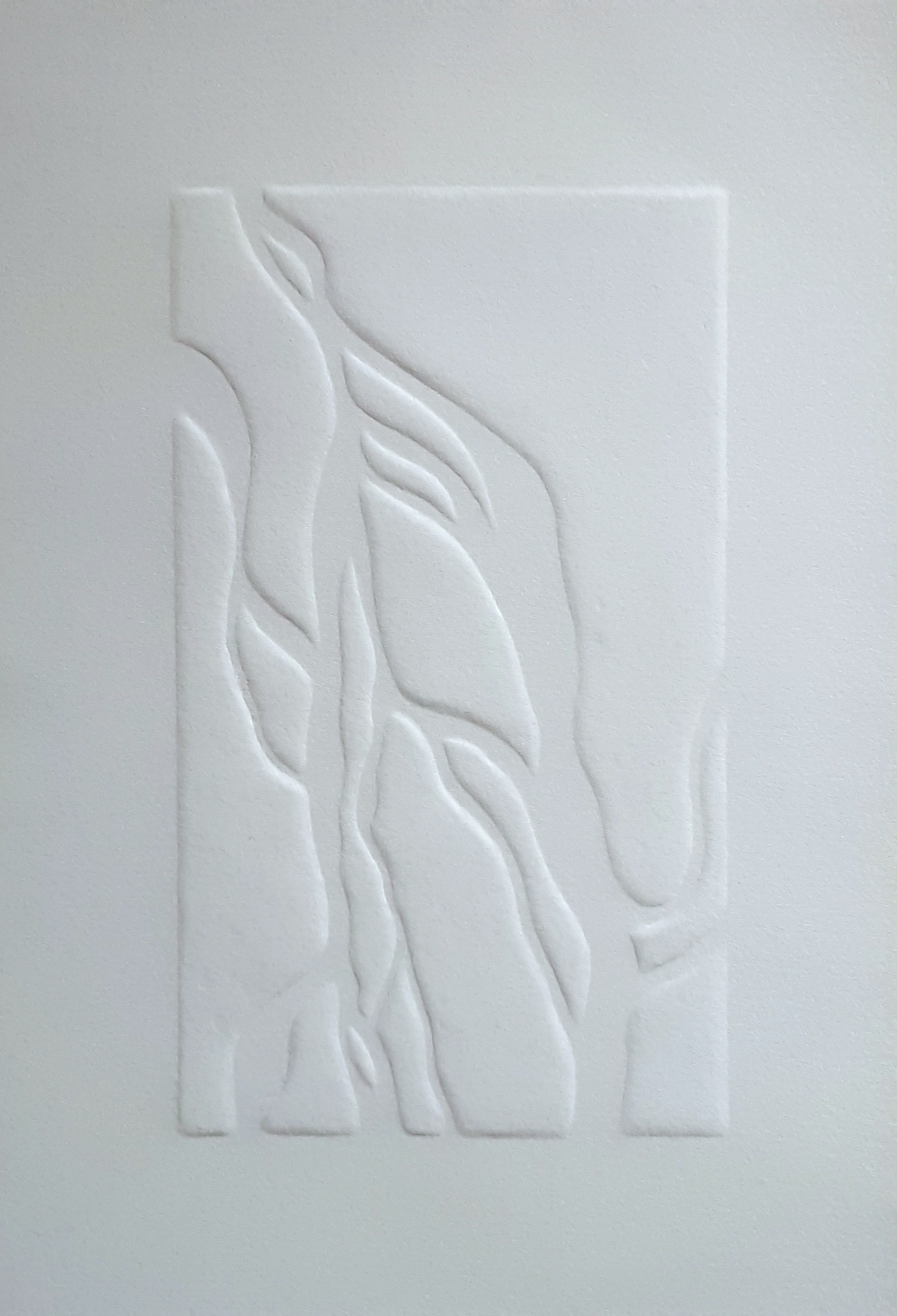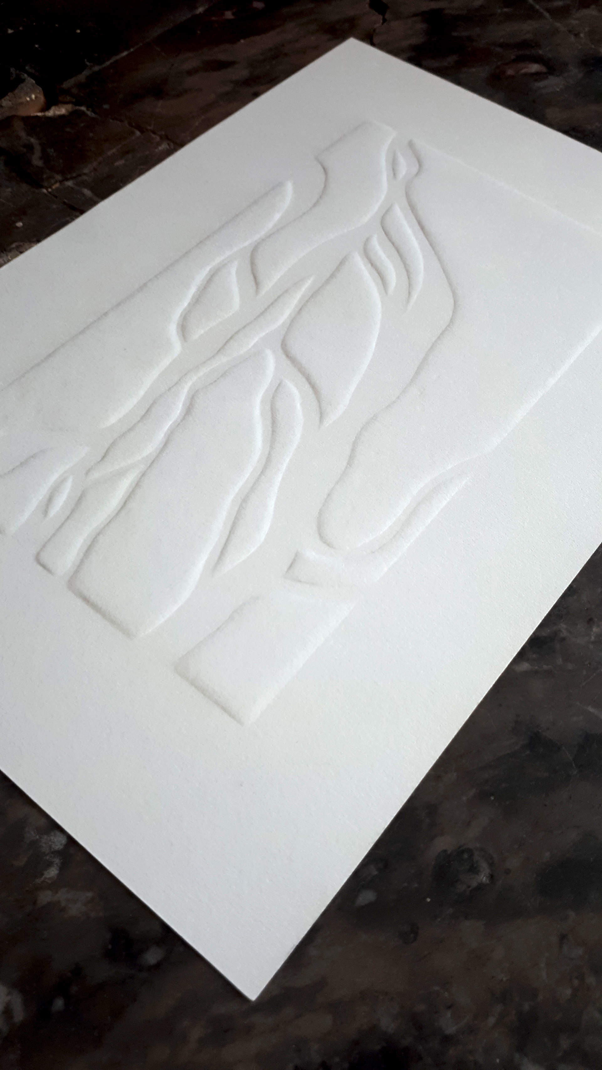 Gaufrages à sec dont les formes d'apparence abstraites sont inspirées des sillons laissés par la mer sur le sable. Une stylisation d'un détail du paysage qui prend vie au gré de la lumière.