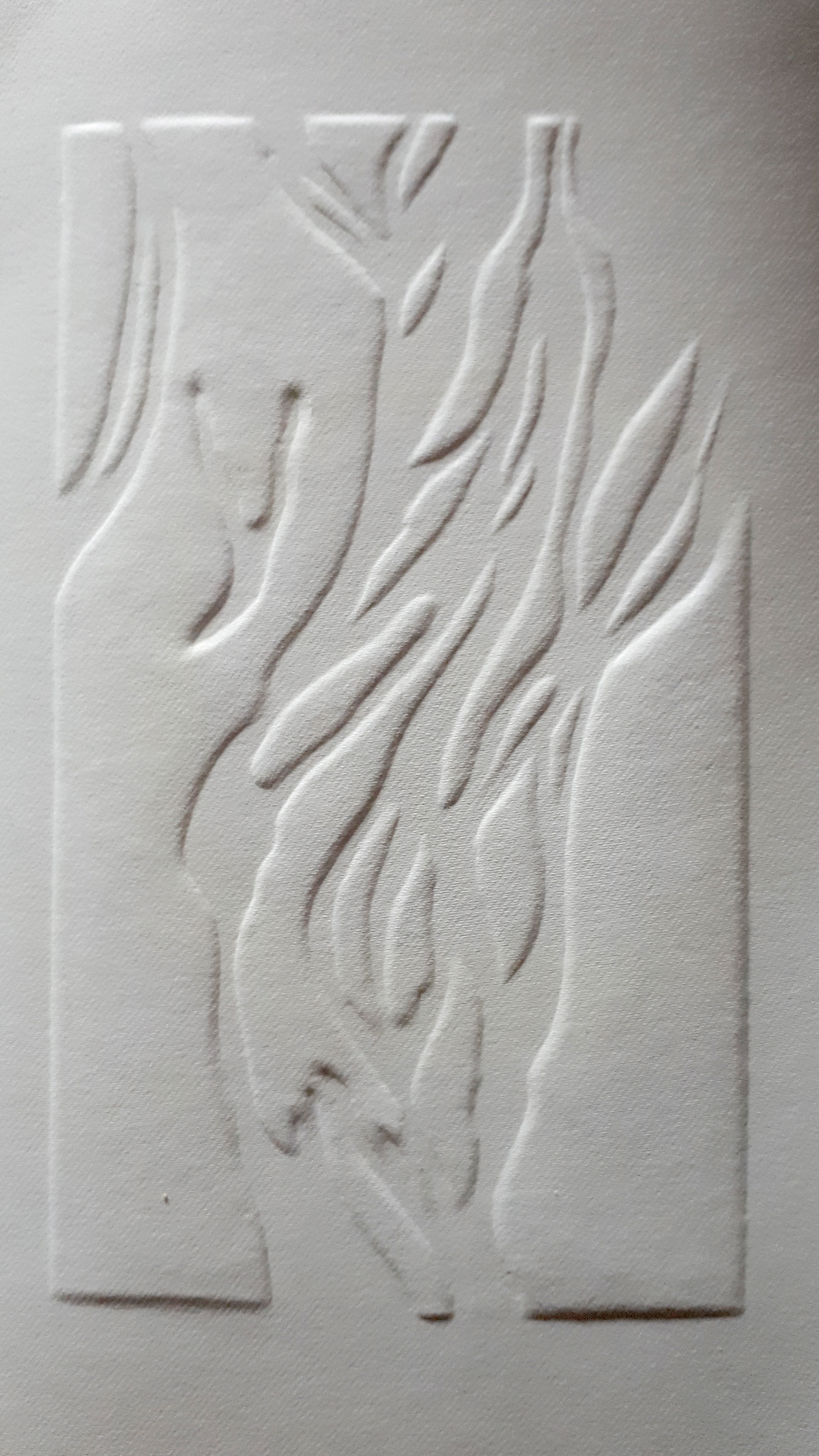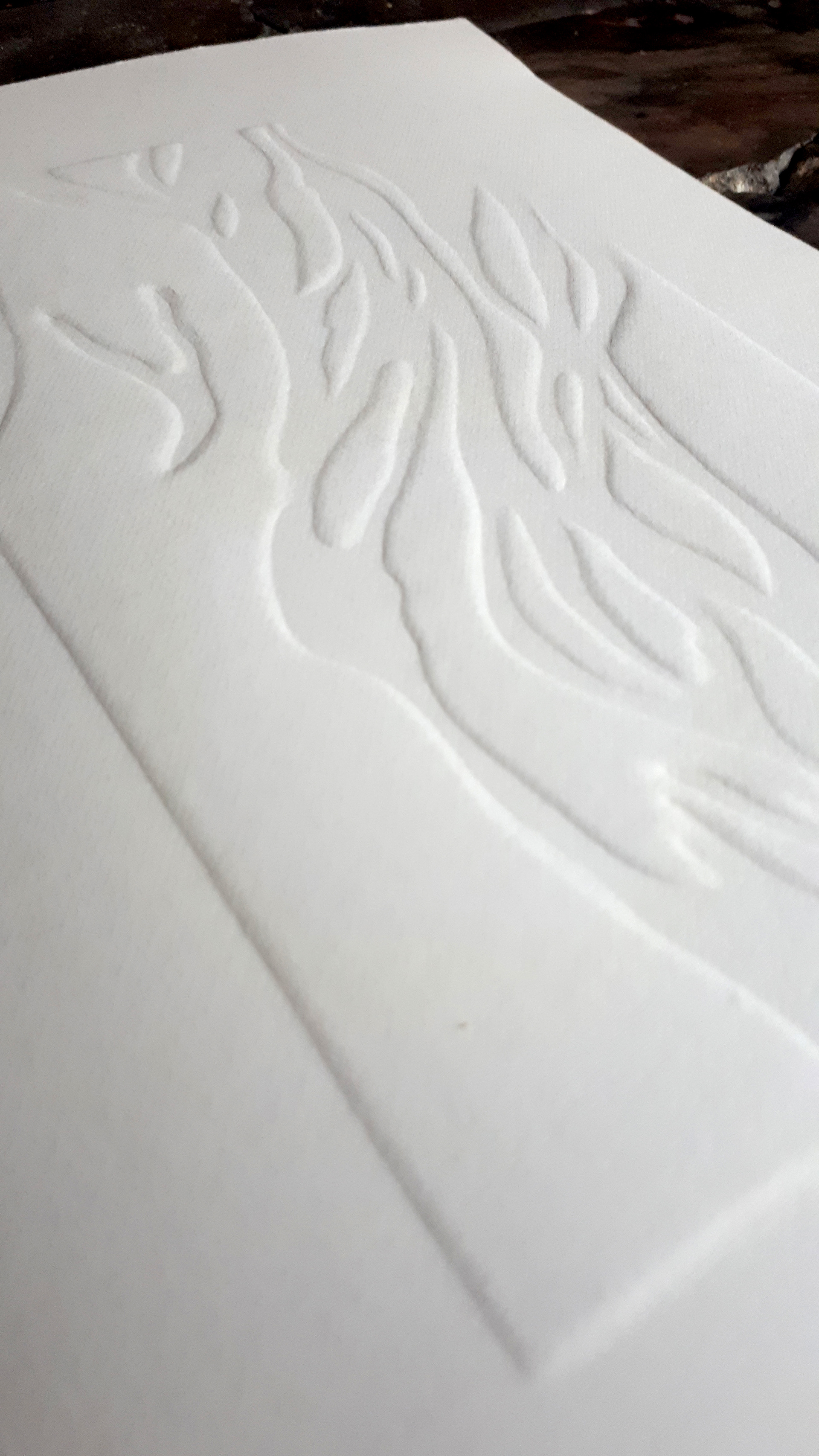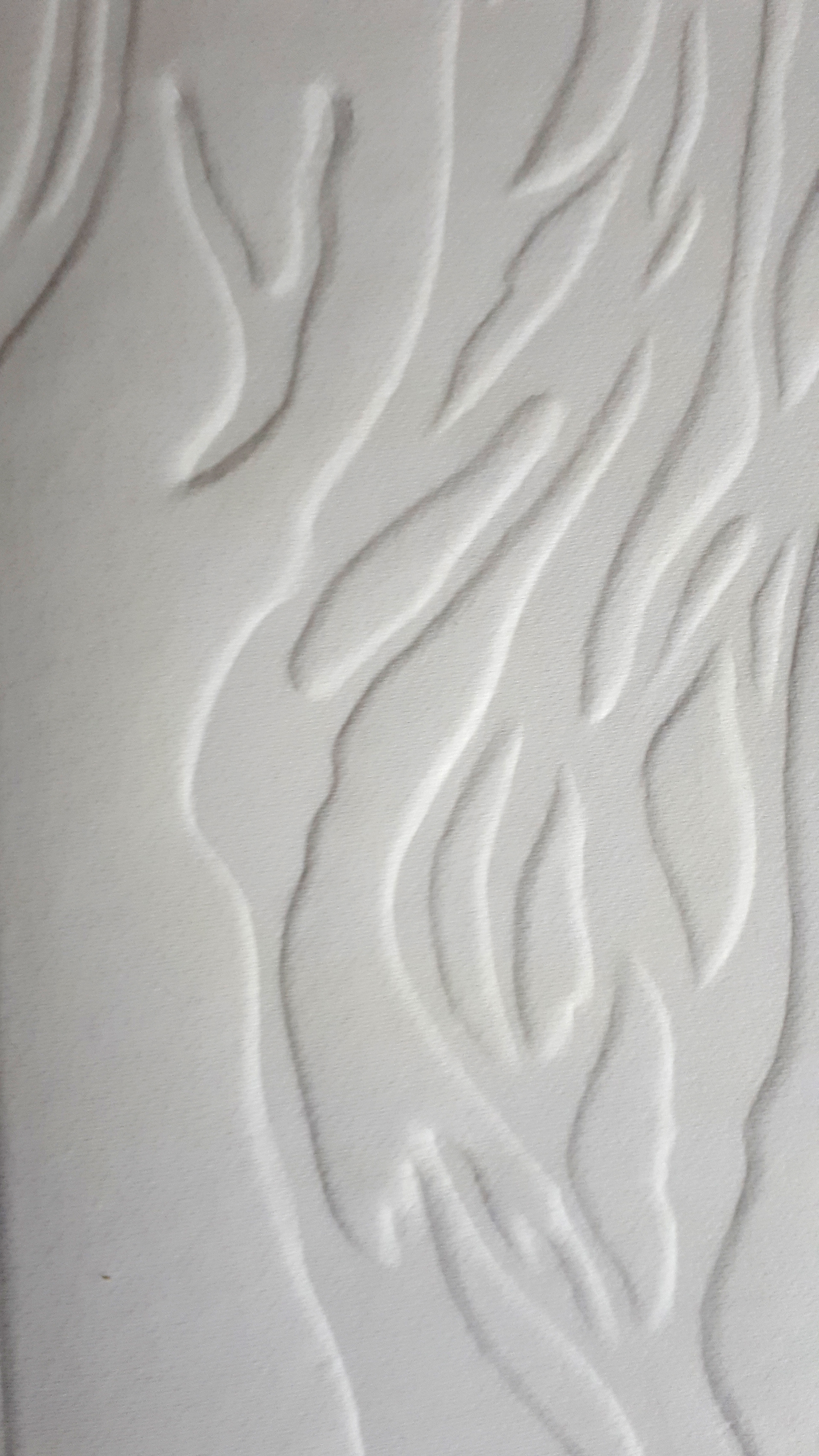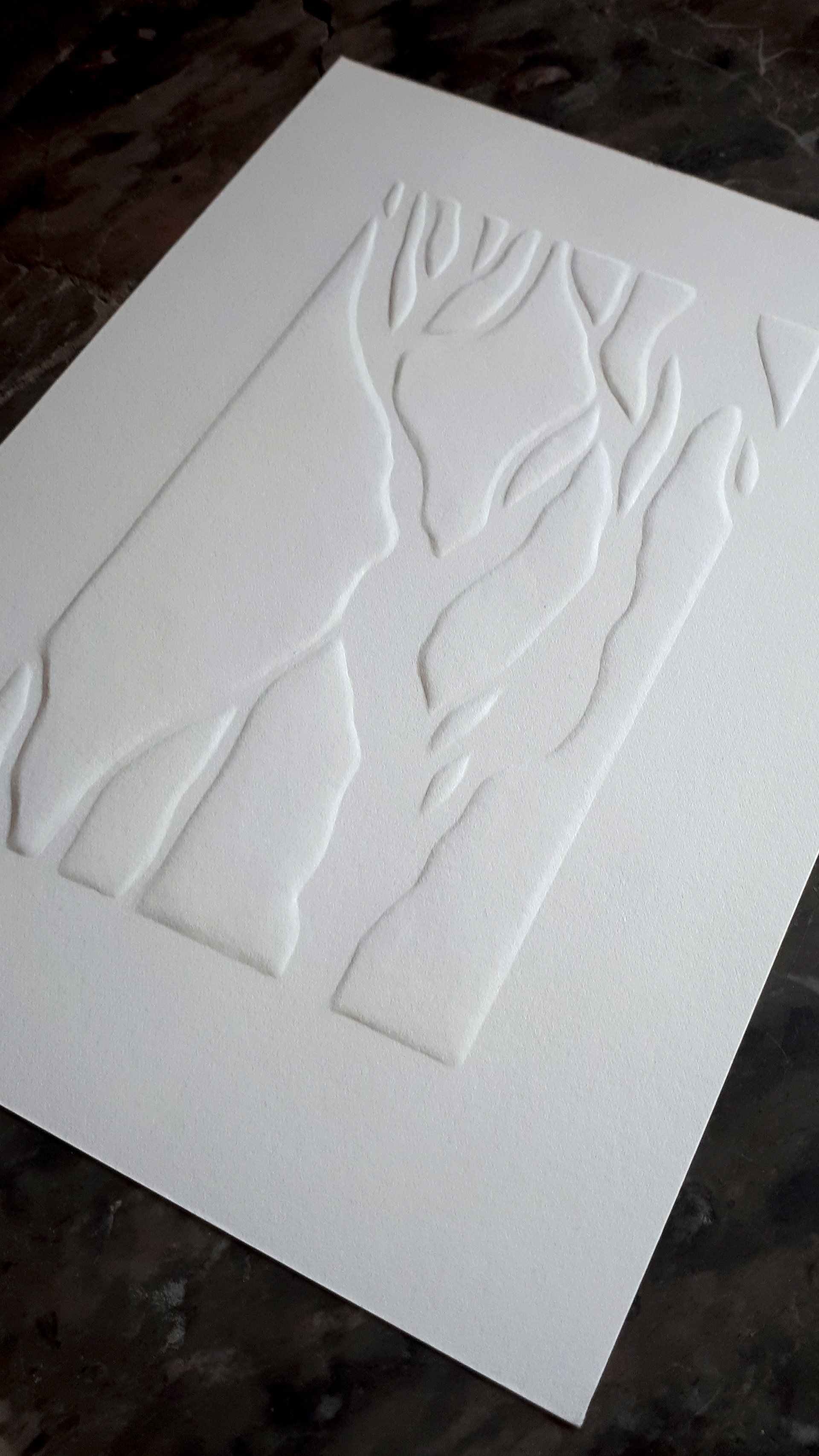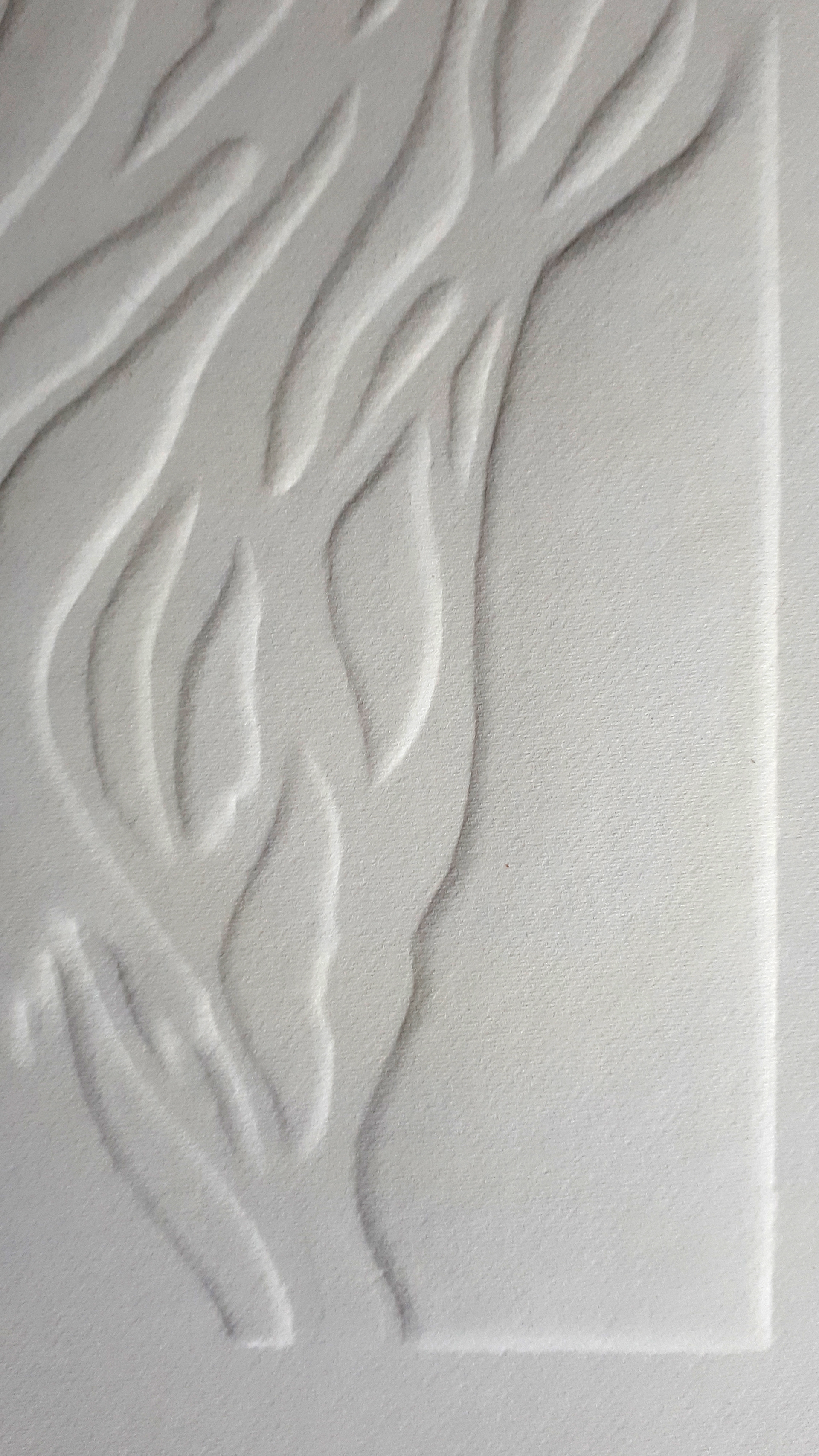 Gaufrages à sec dont les formes d'apparence abstraites sont inspirées des sillons laissés par la mer sur le sable. Une stylisation d'un détail du paysage qui prend vie au gré de la lumière.